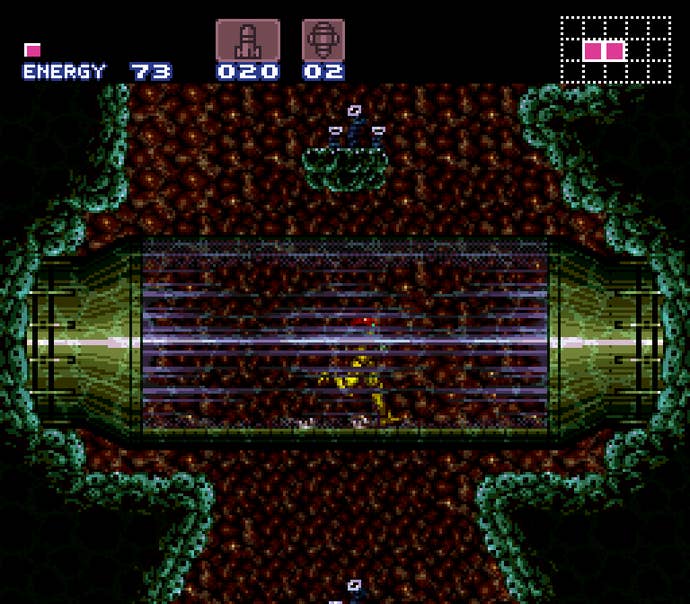 Super Metroid revels in subverting the player's assumptions like this, in putting unexpected spin on what had come before. Plummet through one of the false floors that littered the original NES game's labyrinths and you once again have to deal with the chore of working your way back up to the critical path... but this time, friendly local critters will offer handy diegetic tips to unlock Samus's hidden skills, such as wall-jumping and rocket jumps. You'll encounter a fake version of Mother Brain enforcer Kraid, as in the first game... but this time, the real Kraid turns out to be a towering monstrosity too enormous to fit onto a single screen. You catch a shocking, unnerving glimpse of a metroid while traveling through a conduit in underwater zone Maridia, long before the showdown with Mother Brain... but it turns out to be a failed clone of the space parasite. And once you do encounter metroids (precisely where veterans of the original game would expect to come across them), you don't expect the terrifying new twist that gives the game its title: The eponymous super metroid, a creature altogether different from the lifecycle variants of Metroid II.