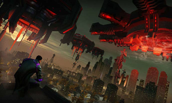 Thankfully, I shouldn't have worried. The sci-fi angle means that Steelport has enough differences to its appearance in Saints Row The Third to make it feel like a completely new place. There's vertigo-inducing alien towers to climb, heavily defended "hotspots" to destroy, and all the cribs you took for granted by the end of The Third are either simply not there or, in some cases, reduced to burning rubble. The Tron-esque digital overlay on everything coupled with the deliberately glitchy graphics (seeing pedestrians with bug eyes and cars that are nothing but wheels and seats never gets old) gives the whole game a distinctive aesthetic all of its own, and the fact that the lighting of the city subtly changes from red to blue as you take control of areas is a particularly nice touch.